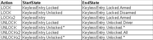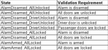 Defining some state information as variables instead of explicitly named states can reduce the state explosion. Sometimes it is easier to define some conditions as state variables instead of specific child states. These state variables can be used to define guarded transitions. Guarded transitions are transactions that are only possible when the specified data condition is met. A requirement that all doors be closed before the example keyless entry system will arm the alarm may be specified as shown below. Without using guarded transitions, adding the difference in behavior based on whether doors are open or closed would require many new states and transitions.